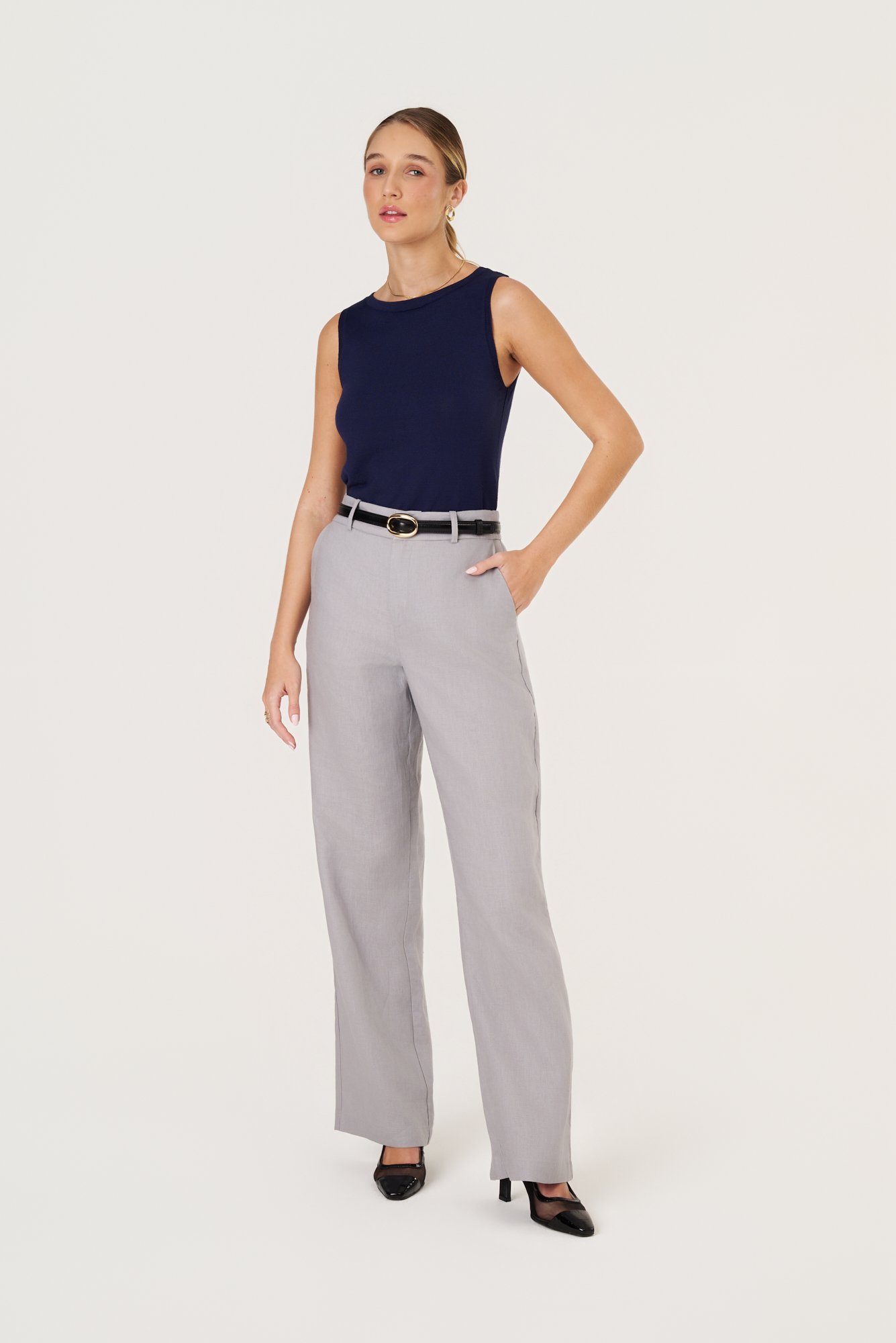 Calça cinza linho blusa com gola